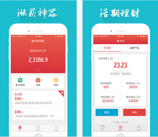 趣生财钱包是一款有趣的金融理财手机应用。随时随地轻松理财,项目收益及时更新,还本付息一目了然,产品上线及时提醒,赚钱良机绝不错过,充值提现一键搞定,是涨薪的神器哦!