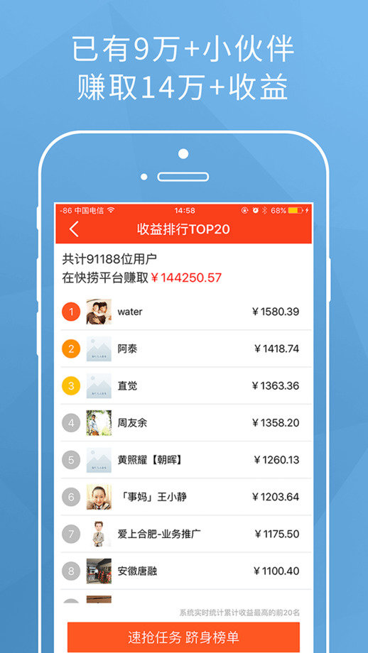 快捞是一款会赚钱的手机分享应用。分享任务,好友阅读即获收益,本地福利。免费领取。一元提现,极速到账。想要在闲暇之时,赚点外快的小伙伴,快来下载吧!