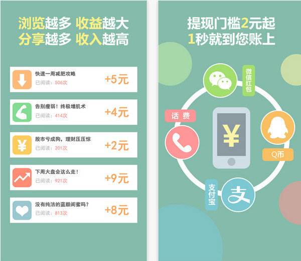 支持支付宝、Q币、话费提现,2元起提,1秒到账