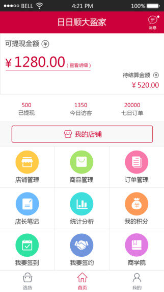日日顺大盈家是一款一站式的店铺管理手机应用。包括我要签约、商学院、商品管理、店长笔记、订单管理、统计分析等实用工具。是想创业用户的必备工具。