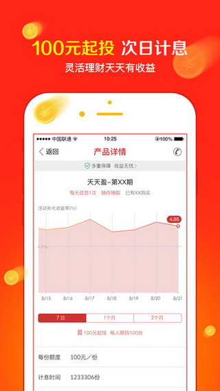 【丰富高收益理财产品】 全方位安全保障,100元起投,年化收益7%-11%,100%本息保障 定期理财:固定收益理财,3个月8%+,6个月9.3%+,12个月10%+ 存本保息:一次性存入本金,每月轻松取息,一年取回本金.