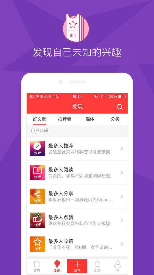 「看荐」支持首页分类阅读,发现频道专题阅读,热门荐客随心关注……在「看荐」里所有用户都是“荐客”,都可以将在微信、朋友圈、浏览器等阅读到的好文章推荐给别人。用户也可以通过点赞、评论、分享等对阅读内容的热度产生影响,进而决定特定内容是否能为更多用户所阅读。同时也欢迎大家将「看荐」与网易云阅读、QQ阅读、百度阅读、掌阅等进行比较,并反馈您宝贵的意见。