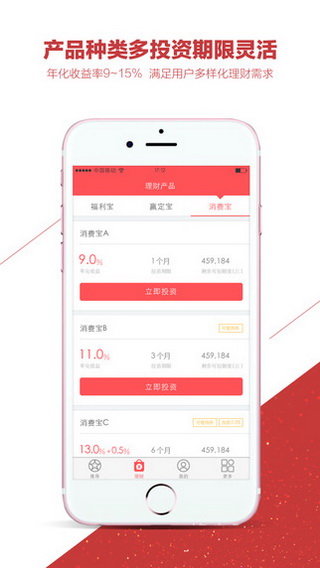 2、多种期限产品选择,投资灵活 7种长短期投资方式可选,12种投资选择;满足用户更多的投资偏好,收益月结或收益复投两种投资方式可选,满足用户更多的收益偏好。