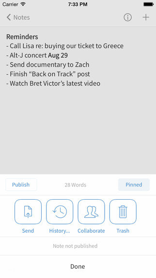TheSimplenoteexperienceisallaboutspeedandefficiency.Openit,writesomethoughts,andyou’redone.Asyourcollectionofnotesgrows,youcansearchtheminstantlyandkeepthemorganizedwithtagsandpins.Workwithotherpeopleonthesamenotebysharingitandpublishnotestothewebforotherpeopletosee.