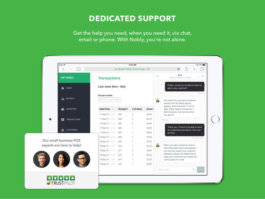 Joinover6,500happycustomersusingNoblyPOS-PointofSaletogrowtheirsmallbusinessfasterandeasierthantheyeverthoughtpossible! NoblyPOS-thenextgenerationiPadePOSforanyretailshop,quickservicelocation,barorcoffeeshop.NoblyPOShascreatedaniPadbased,easytousecashregister,byallowingcustomerstosetuptheirshopinminuteswithoutexpensiveonboardingandsupportcontracts. OurintegratedpaymentsolutionconnectstoEMVterminals,ApplePayreadersandothermobilepaymentsolutionsandallowsmerchantstoseamlesslyacceptbothcredit/debitcardsandalternativecardpayments. NoblyPointofSalesupportsallmajorcurrencies,countriesandtaxesincluding:theUnitedStates,Canada,UnitedKingdom,Mexico,Australia,NewZealand,andallofEurope. SaveTime WithNobly’sintuitivedraganddropset-up,andeasytorunreports,you'llspendlesstimetryingtounderstandyourbusiness,andmoretimegrowingit! DedicatedSupport Getthehelpyouneed,whenyouneedit,viachatoremail.WithNobly,you'renotalone.OursmallbusinessePOSexpertsarededicatedtoyoursuccess! GetResults UsetheNoblyBackOffice,togetkeeptrackofwhatyousell,towhomandwhen!Getaquickoverallpictureordrillintodetails. AcceptPayments AcceptcreditanddebitcardpaymentswithNoblyPOS-PointofSaletogetherwithmanyofourpartnerscardreadersorterminals.IntegratedPaymentPartnersinclude:Payleven,iZettle,SumUpandFirstAmericanPaymentSystem.