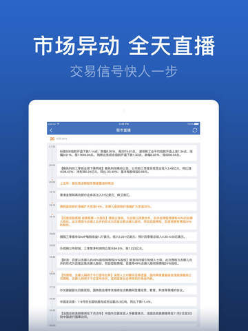 2、股市直播 24小时滚动股市直播功能让你轻松掌握市场实时动态,第一时间获得重要交易信号,不再踏空重要行情,更助你快人一步逃顶成功。
