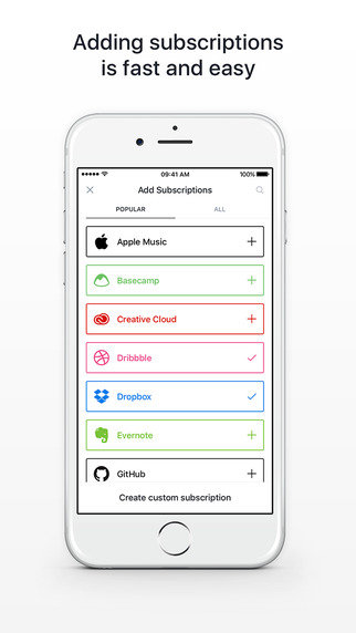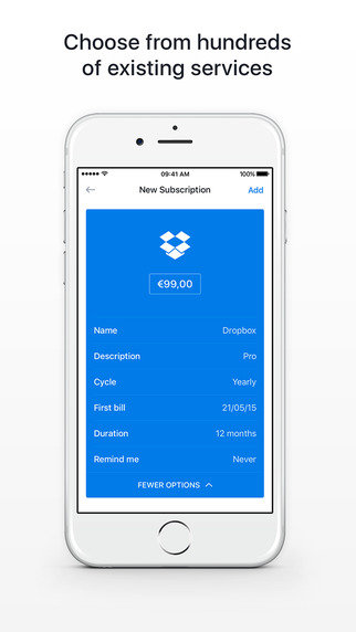 Billy以条目形式记录你每一个订阅服务项,用对应服务的主色调作为背景色,便于辨识。在单个订阅服务中,你可以记录金额、时间、付款周期、描述,并可选择设置提醒,避免了服务过期而忘记续订被停用的尴尬。