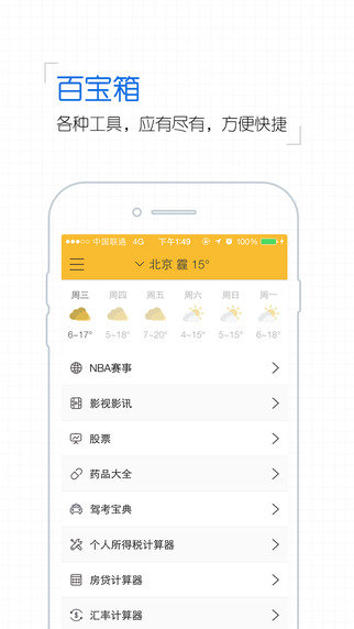 扫一扫、天气、NBA赛事、微信精选、电视节目表、影视影讯、股票、药品大全、驾考宝典、个人所得税计算器、房贷计算器、汇率计算器、公交查询、火车查询、班车查询、手机号归属地查询、有道翻译、老黄历、IOS字体对比