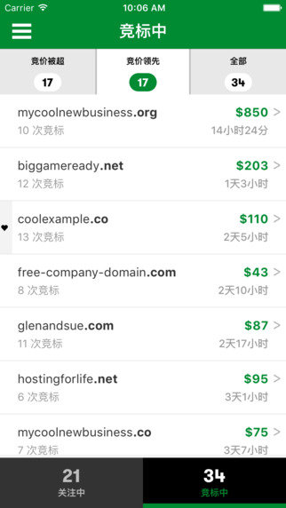 • 竞标域名,并立刻获知您的竞价是最高还是已被超过。