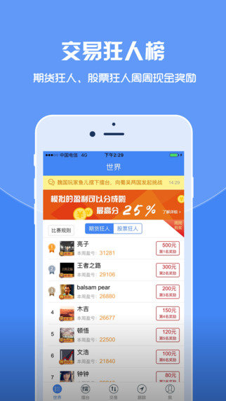产品融入游戏、社交、擂台PK、国战、狂人榜(交易排行)等多种娱乐元素,吸引年轻交易群体的加入。同时通过独特的交易水平考核指标、严格的风险控制、全托管式的跟随交易机制,成就一个交易界未来的淘宝!