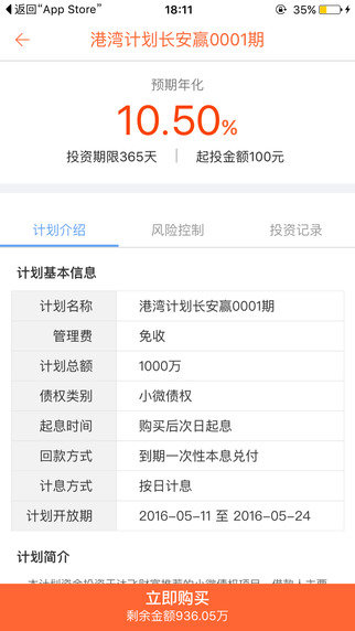 3、高年化收益:一年期理财计划年化收益率10.5%,是银行活期存款收益的30倍;