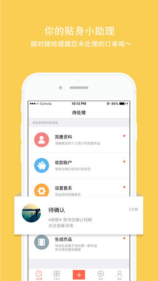 app和微信端无缝链接,打造属于每个摄影师的移动端个人主页,随时随地跟踪订单,管理档期,利用社交网络给摄影师带来更多的客户。拾光盒子,帮助摄影师打理生意,为摄影师提供真正贴心的服务。