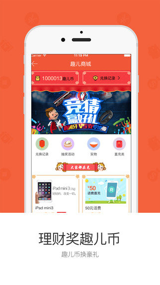 【趣儿币换豪礼】:通过签到,投资等行为获取的趣儿币可以兑换或抽取多种礼品,手机充值卡、蓝牙耳机、iphoneSE等等,只有想不到,没有兑不到