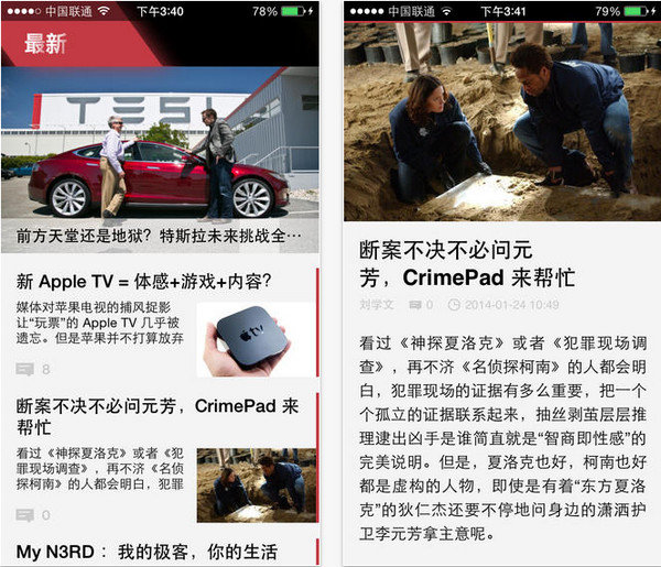 全手势操作是爱范儿iOS应用的重要特点,也是我们对手持应用的独特理解,你可以用手势切换文章栏目、文章评论。操作极其流畅。