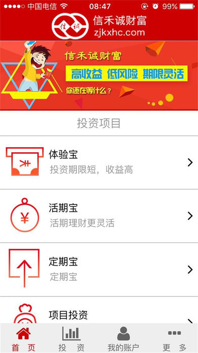 低门槛,高收入:100元起理财,随时随地一点即投。