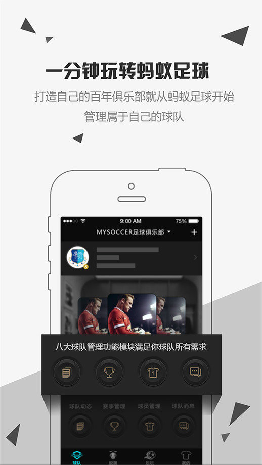 蚂蚁足球是一款现实版足球经理,最精彩足球社区,球队赛事组管理,足球爱好者的家。在这里都是喜欢足球的人,有赛事,有咨询。