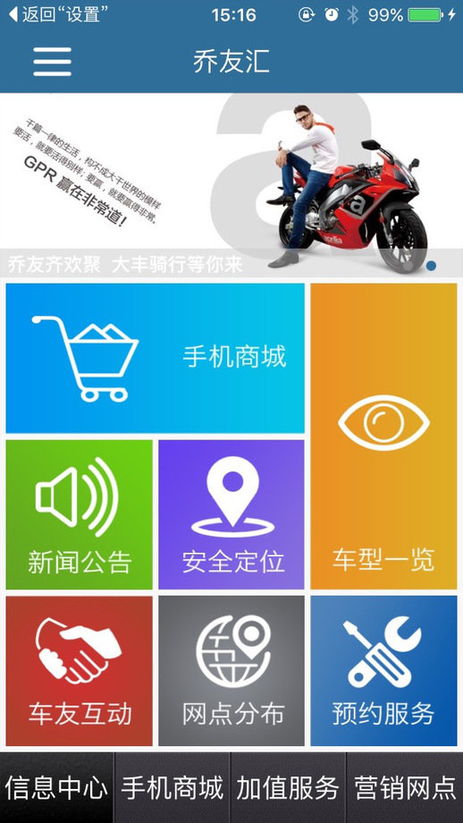 乔友汇是一款摩托车资讯和维修保养服务的软件,提供了新闻中心、安全定位、知识、预约等功能。是宗申比亚乔为了为用户提供更优质而快捷的服务而提供的软件。