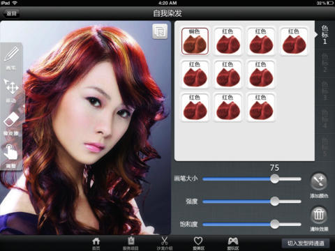 国内最专业的换发型,拥有顾客版和专业版的不同模式,效果逼真,实时换发,预览不同的发型设计效果;并可以对直接裁剪发型、并对其上色。
