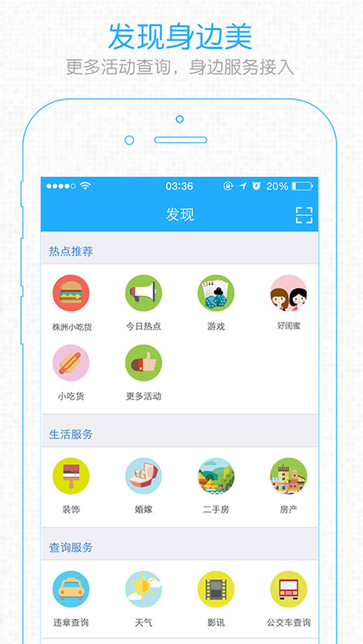 美食5折卡、违章、天气、车票等热门功能查询;