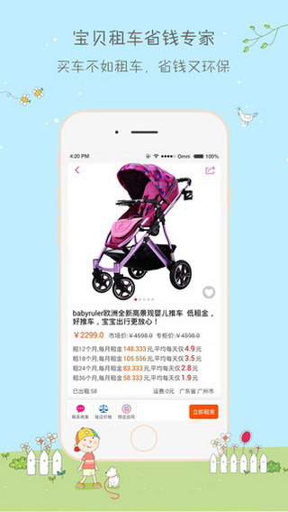宝贝租车1元是一款功能强大的手机租赁服务应用。宝贝租车1元租1年,1元就可以拥有1辆高端婴儿车。价格与天猫京东实时同步,同时还有租凭合同为您保驾护航。