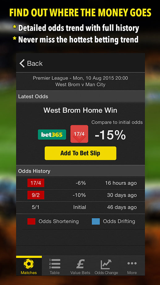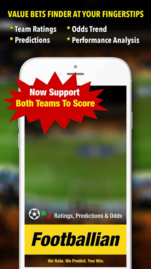 Youwillget: -Predictionsonmatchresults -Valuebetsuggestions -Ratingstocomparetheabilityandformbetweenteams(forbothfootballclubsandnationalteams) -Hottesttrendsandperformanceanalysis -Realtimebet365oddswithfullhistoryandtrends -Customisabletablesforquickcomparison -Startinglineupsbeforekickoff