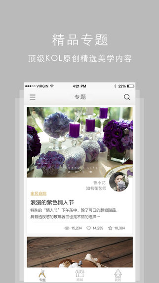 这是一款以自然植物设计为主导,倡导美学生活方式的免费阅读App。以手工DIY的图文混合形式阐述植物美学设计。窥探植物设计师工作过程的纪录类视频,讲述美学生活方式。