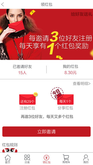 【天天红包】汇购推出“天天领红包”服务,汇购每日将20%的业绩,以“红包”的方式,系统自动发放给用户,红包可用于特卖商城购物或提现,红包分为注册红包和分享红包。让每天拥有更多惊喜!