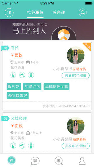美业直聘让达人和boss可以零距离接触,发送即时语音和文字。