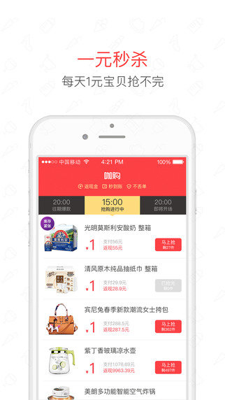 咖购是一款专注于品牌独家限时低价折扣特卖秒杀,独家超低折扣再返现,品牌限时一折,实时订单管理。汇聚淘宝天猫等一线品牌商为买家提供比1元购更实惠的超嗨购物盛宴,是全国首款限时低折扣特卖加高返利的购物应用。