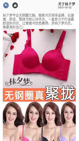 林夕梦内衣是一款关于内衣的互联网商城导购工具。近万件商品,热门推荐,分类清晰,随时随地,轻松购买自己所需。是广大女性购买内衣的必备工具。
