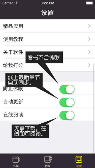 4、简单易用:改进了传统小说阅读器中多种细节,对于每一个细节,我们都力求最易用,给您完美的用户体验。