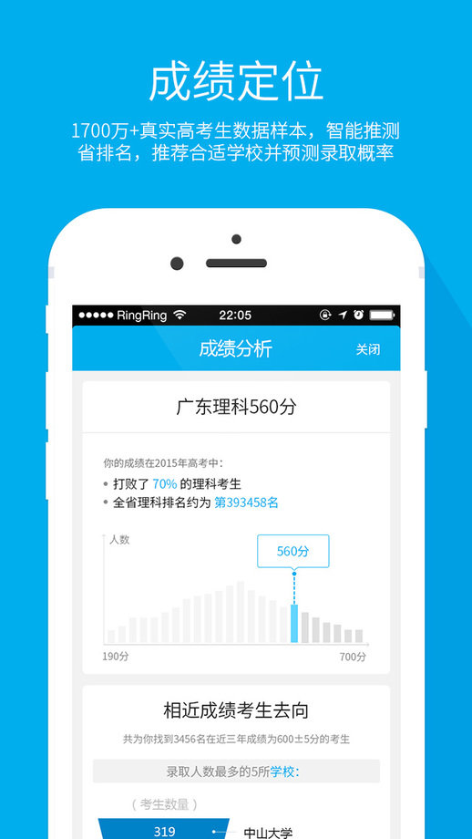 成绩定位:输入模拟考试成绩,智能推测省排名,推荐合适学校并预测录取概率