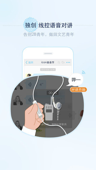 【线控语音对讲】:告别2B青年,做回文艺青年。独创线控对讲技术,利用iPhone原配耳机即可实现线控语音对讲,在锁屏状态下也能玩对讲,配合特别优化的消息提示音,实现对讲盲操作。 基本功能