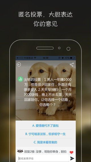 假面是一款匿名社交软件,说出你真心的话,不用在乎别人的眼光,他们也不知道你是谁,让你想说什么就说什么。说真心话不冒险,大步迈进匿名社交2.0时代。