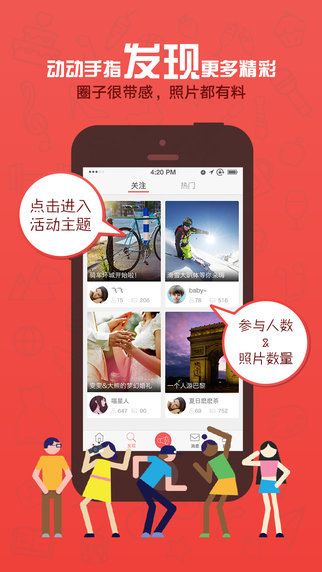 【发照片】轻松晒图,每个人都是活动的摄影师,任何一个角度都不放过,所有照片都轻松收入囊中。更能和朋友们互动,结识活动里的陌生朋友哦~