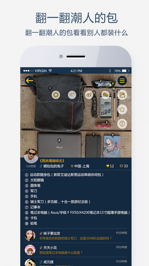 晒呗是一款图片交流软件,关注晒包达人,晒出你的随身物品,看看潮人的包。是晒随身物品的图片社区想知道潮人们每天带着什么出门吗?想知道行业达人都用什么牌子装备吗?快来晒呗窥探别人包里的秘密吧!当然你也可以拍照上传你的随身物品,给图片打上标签,让你的图片说话!和更多的达人交流心得!