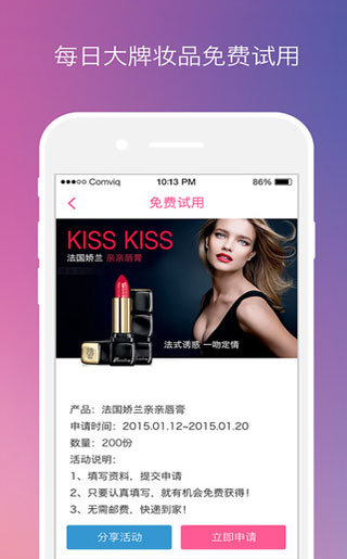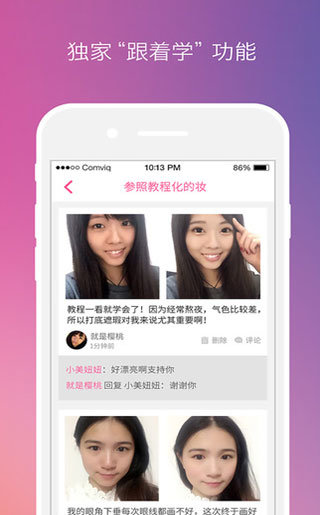 【每日大牌妆品免费试用】 独家“跟着学”功能,参照教程手把手学化妆,免费提供全套妆品,让你从菜鸟变身美妆达人!