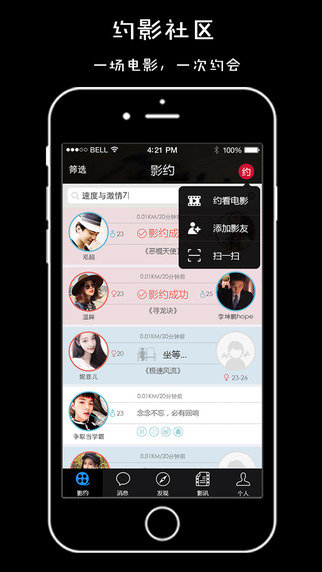 影约吧是一款最文艺的影迷交友约会社区手机应用。最新的电影资讯,观影一点就Go。史上最文艺的社交软件,给约会一个看的见的理由!