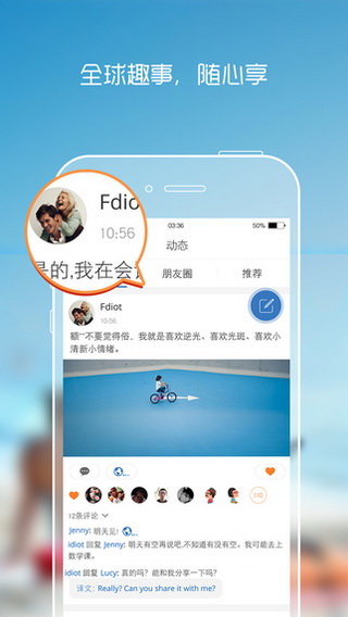 3.动态:个人心情、朋友圈靓照一键轻松分享全球,即时捕捉全球趣事,点赞评论、随时随地和老外精彩互动。完善个人资料,收获更多来自世界各地志同道合的外国友人,将社交朋友圈开拓到国际!