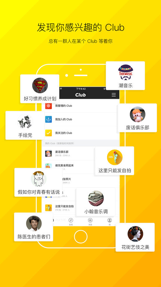 「潮音乐CLUB」 「小翰音乐调」club 「好习惯养成计划」club 「深夜勿看」club 「玩APP」club 「三行情书」club 「随便拍张照片」club 「假如你对青春有话说」club 「咖友俱乐部」club 「手绘党」club 「我是个年轻人,我心情不太好」club 「陈医生的患者们」club ......