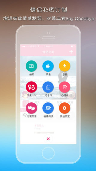 微恋爱为情侣用户专门定制了: 天生一对、心愿单、纪念日、情侣祝福、恋爱关系、情侣阅读等新颖特殊的服务; 情侣聊天时除了传统的语音、文字聊天外,还增加了定位功能、视频聊天功能等新型聊天方式;