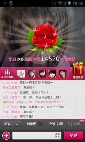 2、免费视频聊天室,有公聊、私聊多种聊天方式,用户还可发送动态表情、羽毛和礼物互赠,而且还有独特礼物展现形式,还可以选择公开或私密发送消息或礼物发送给你喜欢的人。