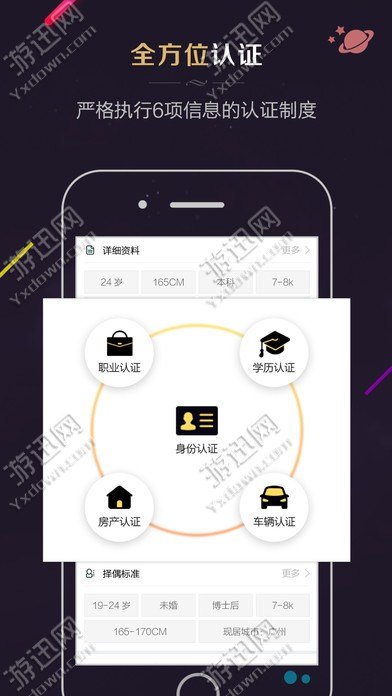 【诚意用户】 身份认证:所有用户需要上传身份证进行严格实名制注册。 学历认证:汇聚高品质用户,人工审核高校毕业证书或学历证明,让才子佳人牵手成功。 职业认证:用户有属于自己的工作或事业追求,收入稳定,有独立的经济能力。 车辆认证:多数拥有名车好车,真实有诚意的认证,具备结婚的硬件条件。 房产认证:完善的个人房产认证资料,让对方有家真实的依靠和温暖。
