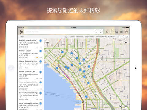 •在主界面可以快速了解网络最新热点、附近的天气及地图,以及您感兴趣的其他信息。一切尽在必应HD主界面