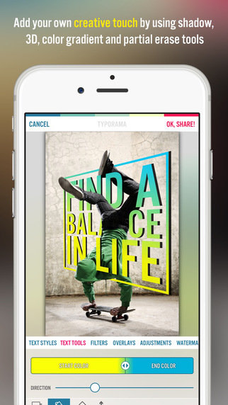 typorama是一款专注于文字和照片编辑的软件。typorama可以让你创造出惊人的视觉效果,通过“自动”转换你的文字和照片变成漂亮的字体设计。只要选择一个背景,在你的单词类型和你的创造性印刷准备!