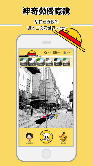 动漫相机是一款海贼王主题的创意摄影APP!千万海贼迷的选择,神奇的动漫滤镜,最强海贼贴纸相机,无论如何请记住我们永远都是伙伴。致力于打造出最IN最有趣的海贼王特效相机!内置高能动漫贴纸,创建你自己的大航海时代!千万海迷的选择,你还等啥呢!?