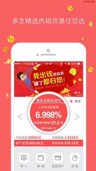 活期乐:支持多货币基金交易。包括:嘉实活期宝(对接百度百赚利滚利,2014年收益相当于活期存款的15.1倍,请在乐理财中查询详情),嘉实货币A(成立10年老基金,支持转换),活钱包(对接京东小金库)和薪金宝。