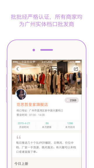 批批是一个基于传统批发市场、开放免费的移动批发平台,专门为服装行业的批发商、采购商而设计。涵盖T恤、衬衫、吊带背心、打底衫、蕾丝衫、雪纺衫、卫衣、马甲、披肩、连衣裙、半身裙、短裙、小西装、外套、牛仔裤、休闲裤、打底裤、短裤、套装等多个品类,覆盖广州十三行、火车站、沙河多个商圈的一手女装货源,是您批发、进货、拿货的首选。批批希望借助移动互联网的力量,让批发变得更轻松,更高效。