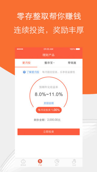 1、每月投资积少成多,最高年化收益率14% 2、为您的"存钱大计"加速,按时完成还有1%额外利率奖励! 3、零存整取,每月多领一份“薪水”