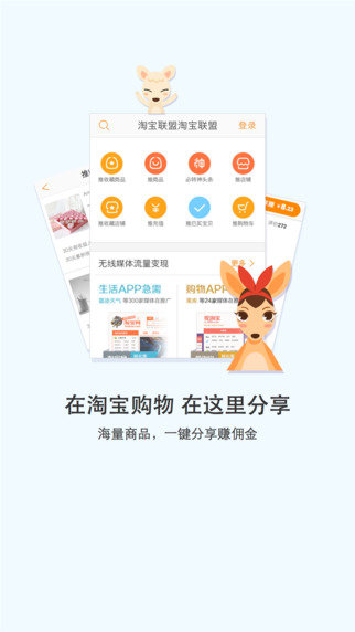 淘宝客们可以随时随地在手机端推广淘宝商品赚钱,玩转各类推广,包括商品推广、店铺推广、活动推广,频道推广,神头条(各种好玩有趣的头条内容)等,一键分享至微信、QQ、来往等各种平台!并且实时同步手机淘宝收藏夹、购物车、已购买宝贝等,可以随时分享!还可以实时查询自己账户的收益情况!无线时代,淘宝联盟APP让你真正步入时髦的自由职业者行列!